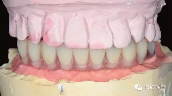 同時(shí)因?yàn)槭羌纯特?fù)重,為了減少不必要的風(fēng)險(xiǎn),通常不制作遠(yuǎn)中的游離端,該病例即刻負(fù)重過渡義齒修復(fù)到兩側(cè)的第二前磨牙,待永久修復(fù)時(shí)再增加兩側(cè)的第一磨牙。