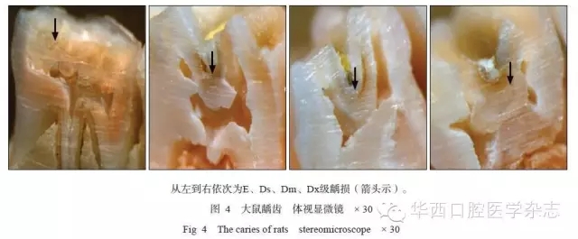 第11周時處死大鼠,取上下頜骨標本,染色,根據(jù)Keyes經(jīng)典評分方法[5] 對磨牙進行齲損評定,將齲損分為4級。E級:僅限于釉質;Ds級:累及釉質及牙本質外層1/4以內;Dm級:累及牙本質厚度的1/4至3/4;Dx級:累及超過牙本質厚度的3/4,甚至達牙本質全層。