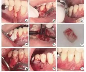 9)遠中半厚瓣轉(zhuǎn)位完全覆蓋移植結(jié)締組織瓣,近中使用6-0線行間斷縫合,齦乳頭處行8字縫合,嚴(yán)密關(guān)閉創(chuàng)面(圖2h);