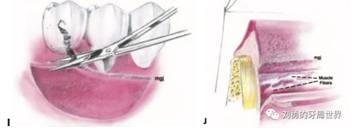 6、剪刀去除殘留的條狀牙槽粘膜(I),骨膜床預(yù)備結(jié)束(J)