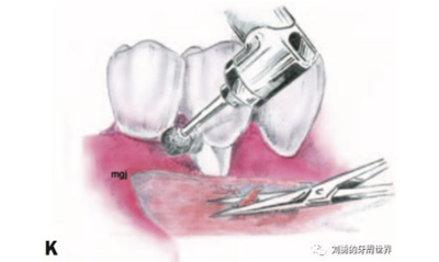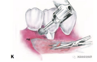 7、剪刀去除骨膜上剩余的肌肉組織纖維(K),可以將翻開(kāi)的半厚瓣剪掉或根向縫合在前庭溝的骨膜上。
