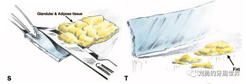4、將移植瓣去除脂肪腺體,放在鹽水紗布上修整確保表面光滑、厚度均勻(S、T)