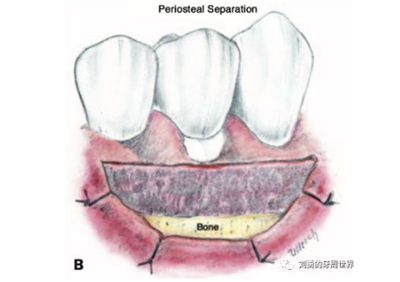 還有人提出來(lái)的改良方法是在半厚瓣骨膜床的根尖區(qū)域做全厚層切口,離斷來(lái)自根向的肌肉纖維或系帶的牽拉,該方法稱之為骨膜分離的方法,如下圖: