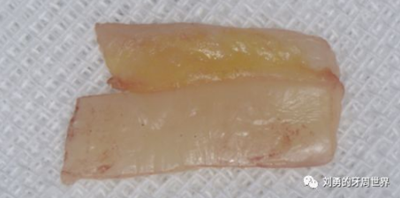 為了減少取瓣大小,從上腭取厚一點(diǎn)的齦瓣,然后用刀片平行于表皮表面將齦瓣片切成兩個(gè)厚度一致的齦瓣,然后進(jìn)行移植,這樣切成的兩個(gè)齦瓣一個(gè)有表皮,一個(gè)沒(méi)有表皮是單純的結(jié)締組織。如此的片切可以使齦瓣變成雙倍的大小使用,減少了供區(qū)的取瓣面積。