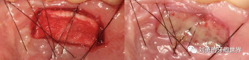 第五個(gè)要說(shuō)的改良就是受區(qū)半厚瓣的改良,一種使用手術(shù)刀翻開(kāi)半厚瓣,暴露骨膜床的方式,該方法操作起來(lái)困難尤其是后牙區(qū)域,另外一種方式是用高速手機(jī)金剛砂車針大量噴水磨除受區(qū)表皮組織的方法來(lái)暴露骨膜床,該方法操作簡(jiǎn)單粗暴,出血多。如下圖: