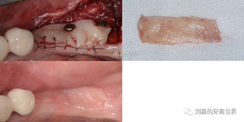 上圖中,種植體唇側(cè)缺乏附著齦,從上腭取瓣,常規(guī)做法:取長(zhǎng)而寬的齦瓣,這樣供區(qū)面積大,術(shù)后疼痛重。