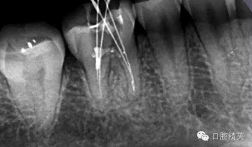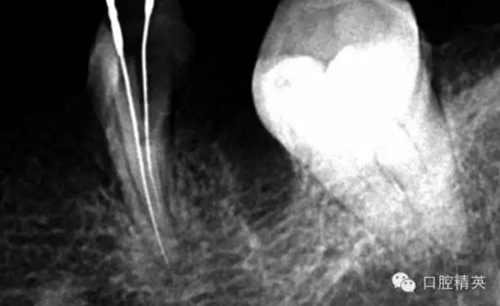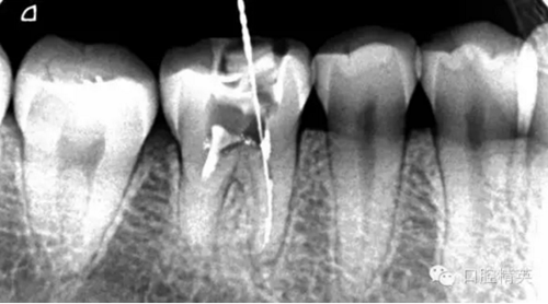 根尖孔偏移,或者是片子角度問題,導(dǎo)致我們很難判斷,感覺像是測(cè)穿。但是我們有根測(cè)儀(前提它是好的),因?yàn)楦鶞y(cè)儀是我們目前對(duì)根管測(cè)量最具有說服力,也是最為客觀事實(shí)的。根測(cè)儀沒有顯示一探入根尖下三分之一顯示“over”的情況(我用的是登士博根測(cè)儀)根管內(nèi)無滲出,可以測(cè)出根管的長(zhǎng)度。那就證明工作長(zhǎng)度的存在,和可信。在看看正題的近中根的器械,我想問問大家覺得是什么器械??