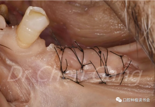 3.2.4 在種植體唇側(cè)植骨,覆蓋膠原膜,膜釘固定后,水平褥式+間斷縫合關(guān)閉創(chuàng)口(圖14)