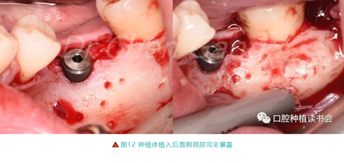 3.2.2 植入ASTRA種植體,頰側(cè)皮質(zhì)骨開孔(圖12-左),取自體骨屑(圖12-右)