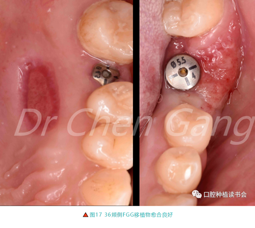 3.3.3 術(shù)后2周,上腭供區(qū)、36頰側(cè)移植區(qū)均愈合良好(圖17)