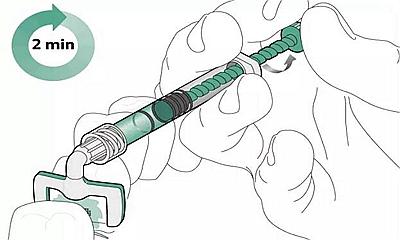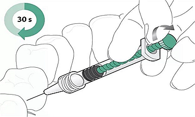3、 旋轉(zhuǎn)注射器柄部1-2圈,使在齲損牙面上有足量的愛康酸蝕劑Icon-Etch,靜置兩分鐘并除去多余材料單手即可旋轉(zhuǎn)注射器。