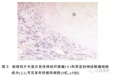 術(shù)后病理檢查結(jié)果示(圖3):右上角(星號(hào)標(biāo)記)為良性的神經(jīng)纖維瘤成分,左下角(三角形標(biāo)記)為惡性神經(jīng)鞘瘤成分,后者見多形性的梭形細(xì)胞,細(xì)胞形態(tài)畸形,且前者向后者過渡。