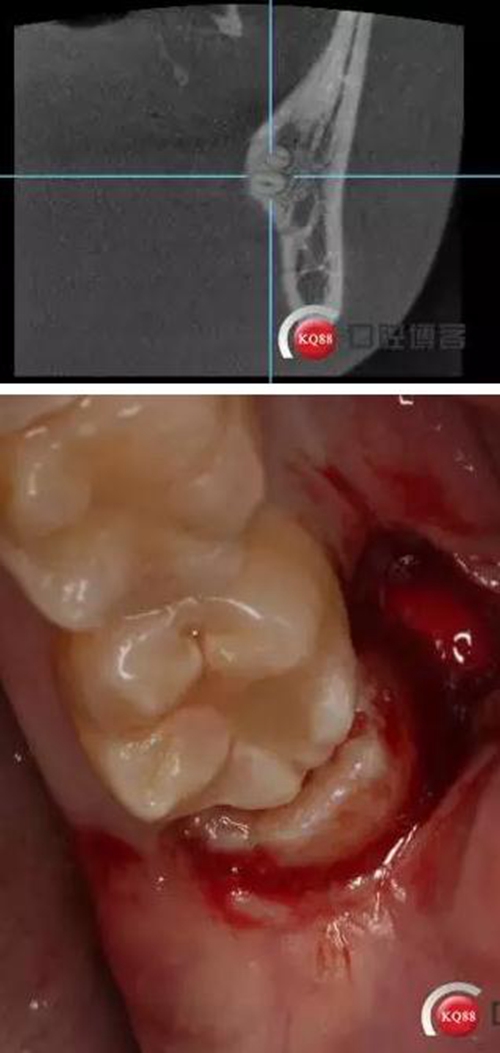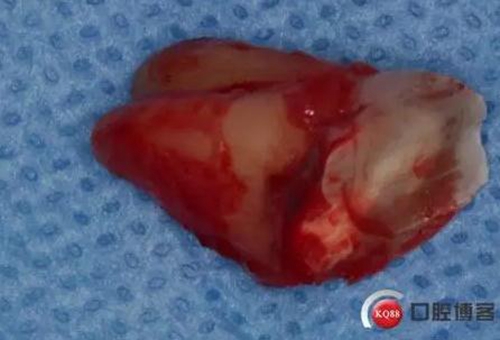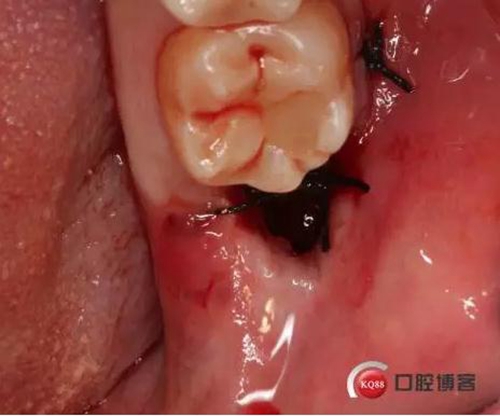 處理:治療計劃及費用已說明,知情同意后,排除拔牙禁忌癥:口腔黏膜消毒,左下頜阻滯麻醉成功后,切開翻瓣,渦輪機去除近中阻力,向近中挺出患牙,拼對牙體完整,清創(chuàng),置明膠海綿,縫合傷口,咬棉球壓迫止血