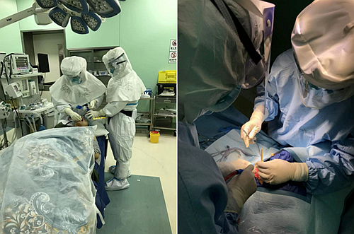 晚7點(diǎn),在完成方案討論和征求家屬同意后,手術(shù)開始。因患者創(chuàng)面仍在持續(xù)大量出血,即使術(shù)前禁食禁飲,圍術(shù)期因飽胃及口腔內(nèi)出血發(fā)生誤吸的風(fēng)險(xiǎn)也非常大,且一旦出現(xiàn)血液和呼吸道暴露的情況,醫(yī)務(wù)人員尤其是麻醉醫(yī)生被感染的風(fēng)險(xiǎn)極高。同時(shí),為了給手術(shù)留足操作空間,麻醉科徐道杰、馮光敏醫(yī)生選擇經(jīng)鼻氣管插管。按照飽胃病人處理,兩位醫(yī)生在充分吸引口腔內(nèi)出血后進(jìn)行快速麻醉誘導(dǎo),待患者意識(shí)消失后30秒內(nèi)順利建立氣道,這是轉(zhuǎn)型定點(diǎn)醫(yī)院后麻醉科開展的首例經(jīng)鼻氣管插管,為后續(xù)手術(shù)的順利進(jìn)行提供了安全保障。