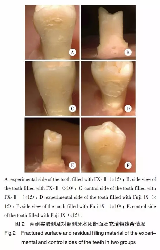 1.2.3 體視顯微鏡觀察:將剪切實驗后的標(biāo)本置于體視顯微鏡下,通過觀察各組破壞后牙本質(zhì)斷面及充填物殘余情況,分析牙體預(yù)備方法對牙本質(zhì)與充填材料間粘結(jié)強度的影響。