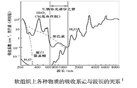 生物體的主成分是水,此外還有蛋白質(zhì)、脂肪、無(wú)機(jī)質(zhì)等皮膚、肌肉、內(nèi)臟的軟組織中的水分,水總共占生物體重量的大約70%。水對(duì)紅外光有著很強(qiáng)的吸收帶,因此,若在這些軟組織上照射紅外光,可以高效地把光能轉(zhuǎn)換成熱量。在生物體中除了水以外的典型的光吸收體,有血液內(nèi)紅血球中的血紅蛋白,如去除血管瘤。