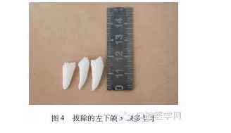 治療計(jì)劃:分次拔除7顆多生牙,2顆埋伏多生牙因無臨床癥狀,可暫觀察。拔除的多生牙牙根均發(fā)育完全,形態(tài)除34之間1顆似下尖牙,其余均似前磨牙,牙體比正常牙略小。圖4所示是拔除的左下頜3顆多生牙。