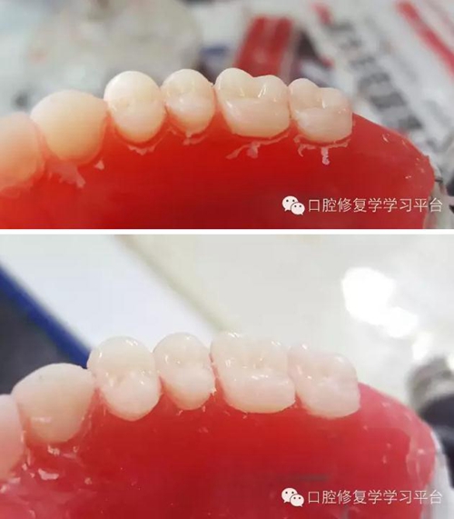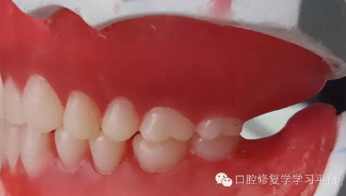 由于在拋光過程中基托蠟受熱,隨后在冷卻過程中會收縮變形,人工牙無法保持在原有位置,而最終影響咬合關(guān)系。因此拋光后再一次檢查牙齒的位置和咬合關(guān)系是否正確。上下頜第二磨牙遠中面以后的基托不能有接觸。