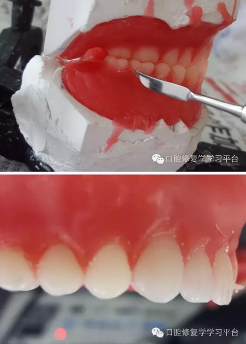 基托厚度和外形進行修整。先用雕刻刀和蠟勺對基托表面進行初步削平和燙平,使得基托厚度和外形達到要求,然后再用煤氣噴燈進行表面拋光。