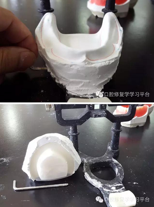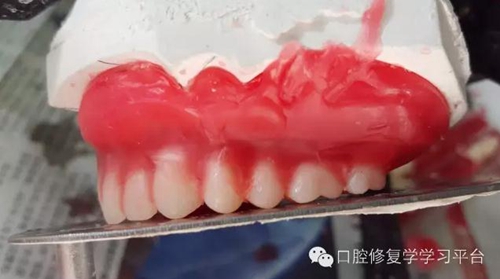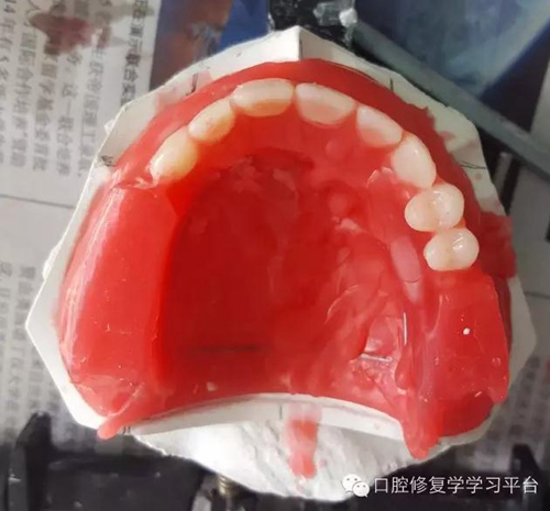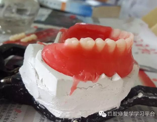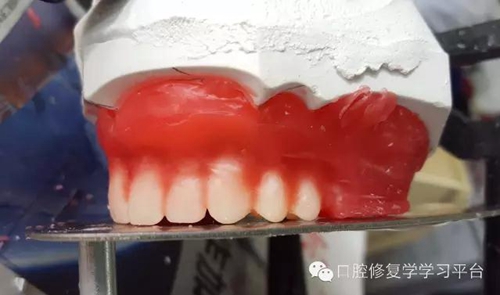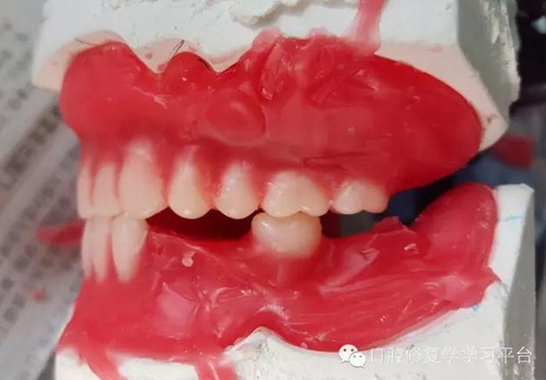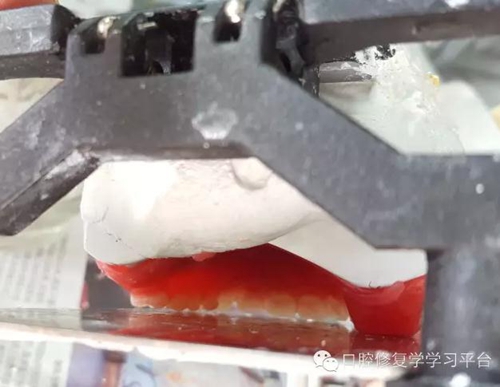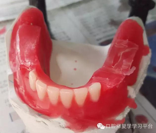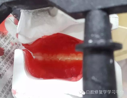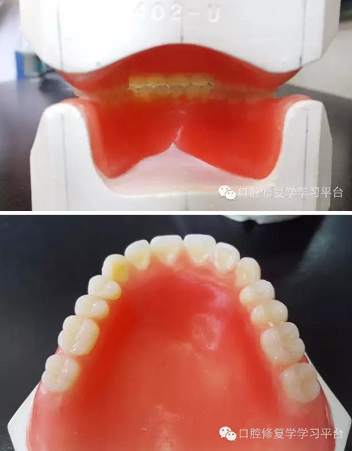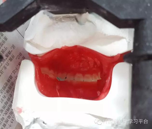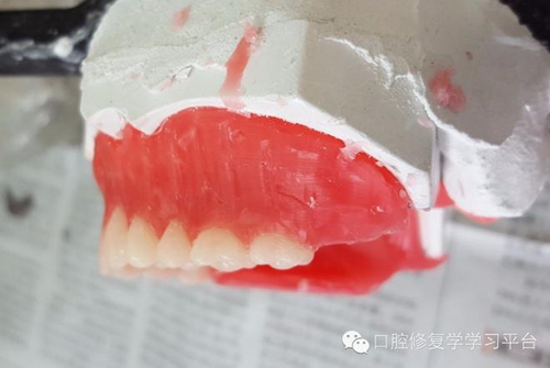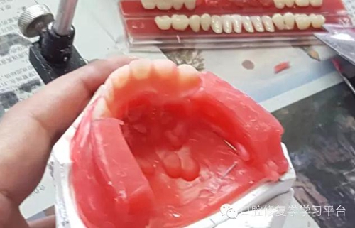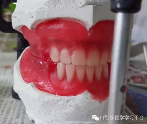 如果人工牙過長或者頸部接觸模型時(shí),只能調(diào)磨人工牙的蓋嵴部,否側(cè)頸部是無法向舌側(cè)排進(jìn)去。