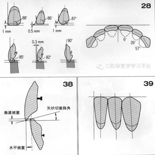 牙冠的旋轉(zhuǎn)度與合堤一致。注意的是尖牙位于口角處,旋轉(zhuǎn)角度最大。如果旋轉(zhuǎn)角度過小會導(dǎo)致后牙排列位置不正確。