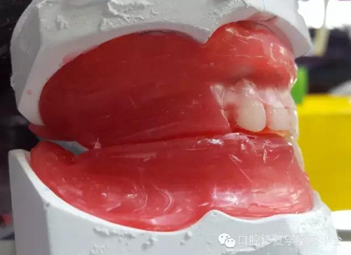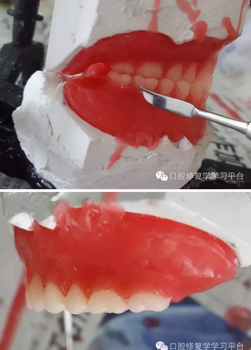 7.1 牙齦成形。先用蠟將基托唇頰面修整成凹面型,齦緣和牙間隙處用蠟填滿,唇頰側(cè)齦緣厚度1mm。