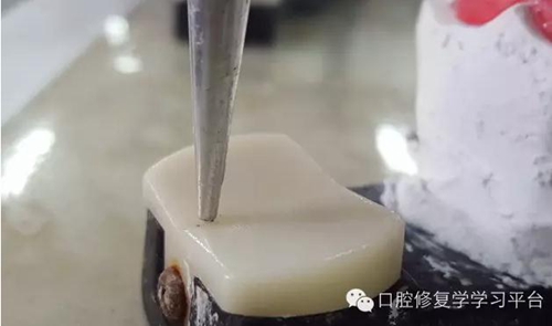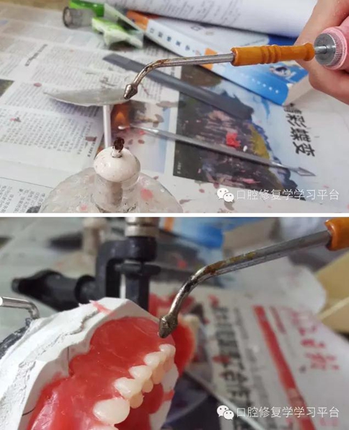 用雕刻刀反向在人工牙牙齦邊緣位置刻出標(biāo)記線。標(biāo)記線以上牙面的蠟要清除干凈。