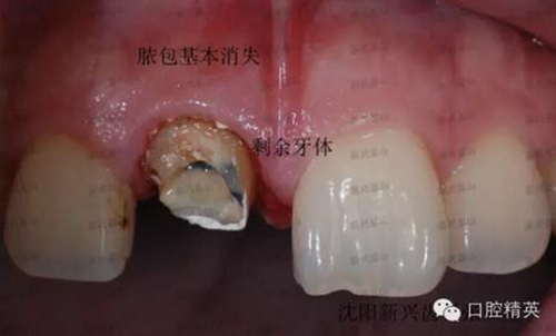 去掉烤瓷冠,去掉松動老式螺紋固位釘,其內(nèi)大量的腐爛牙質(zhì),治療之后,剩余牙體很少,如上圖所見。根管治療后,牙齒健康,膿包消失,可以進行后續(xù)的治療,讓患者拾回自信。