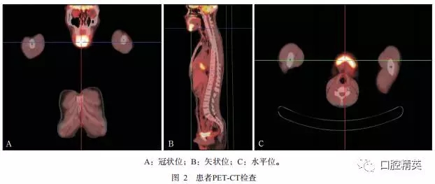 本文病例具有以下特點(diǎn):1)患者病因不明,病變區(qū)域無(wú)齲壞、慢性牙周膿腫以及創(chuàng)傷史,提示還有其他途徑或者不典型的不易察覺(jué)的輕微感染,給疾病一開(kāi)始的診斷帶來(lái)了困難;2)病變范圍廣泛,累及雙側(cè)下頜骨,較罕見(jiàn),單純臨床判斷易造成誤診;3)輔助檢查結(jié)合了CBCT、PET-CT、病理學(xué)及免疫組織化學(xué)檢查,明確了診斷并避免了誤診;4)治療徹底清除病變組織,包括增生的骨組織和肉芽組織,結(jié)合應(yīng)用足量抗菌藥物取得了較好的治療效果。對(duì)于Garrè's骨髓炎的病因及病理機(jī)制仍需進(jìn)一步研究。