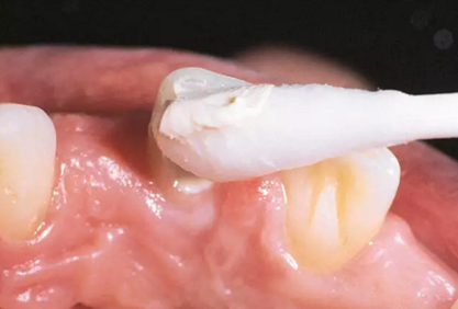 2將匯合的UltraTemp通過Skini輸送頭常規(guī)地直接放在指定位點。完成前使用濕紗布或濕棉簽去除多余的凝膠。