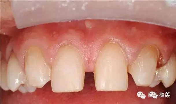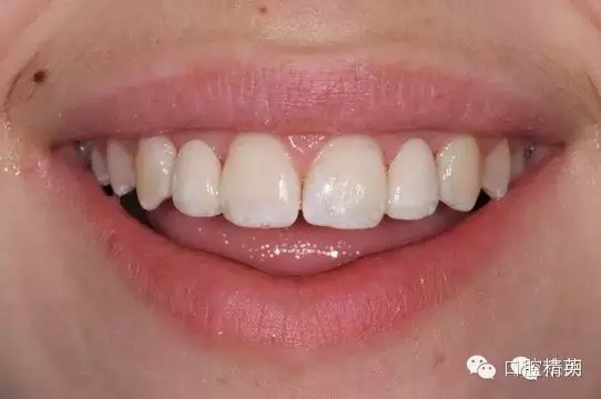 最后用雙固化的樹脂水門?。―uo-Link)粘固貼面。準確就位后,先在牙頸部光固化3秒,去除多余的水門汀,然后再光固化40秒。自固化時間需等待5分鐘。