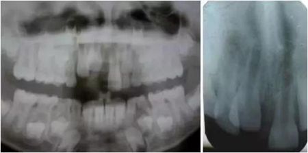 牙11,12 和21對叩診敏感。牙11嚴(yán)重挫入(牙11和牙12的切緣相差7毫米),并挫入牙槽窩。與牙21相比,牙12大約挫入4毫米。