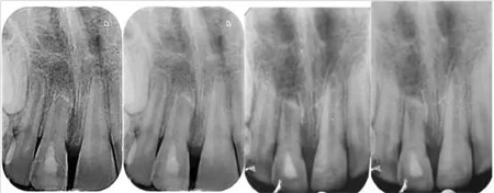 隨訪12個月的X線記錄顯示:在年輕恒切牙的根管壁上有硬組織沉積。從長度上看,牙根并沒有繼續(xù)發(fā)育,但根尖處硬組織沉積,而且?guī)缀蹰]合了(圖 8)。