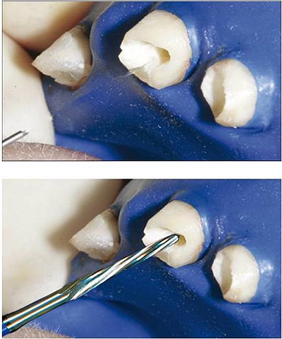 殘根殘冠均予以完善的根管治療,術(shù)后X線片顯示根充密合,觀察1—2周無根尖反應(yīng),再進行牙體缺損修復(fù)。修復(fù)操作步驟:①確定根管及選擇纖維樁:通常前牙、前磨牙選擇一個根管,后牙根據(jù)牙體組織的殘留量及根管粗細情況來選擇2—3個根管,按照根管充填治療時的原始記錄或X線檢查根管大小和長度,選擇對應(yīng)玻璃纖維樁,要求纖維樁使用后,根尖部保留3—5mm牙膠尖.