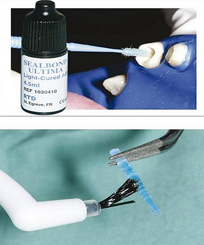 將樹脂粘接劑均勻地涂抹在根管、牙體的粘接面以及纖維樁的表面,涂抹兩遍