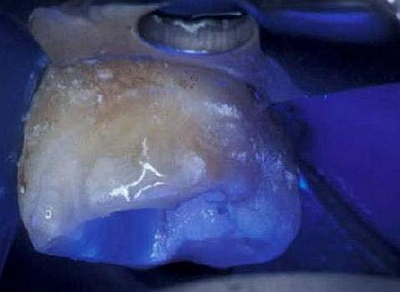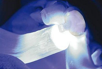 用光固化燈從不同側(cè)面將冠核樹脂材料照透