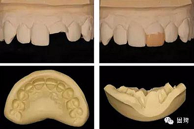 用硅橡膠在口內(nèi)或者技工室制作背板,待固化后修整。將需修復(fù)牙齒的唇側(cè)硅橡膠去除。保留余牙的唇側(cè)部分以便就位。