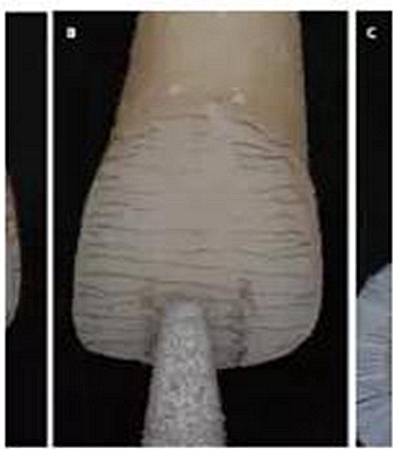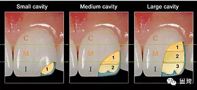 3、分層堆塑牙本質(zhì)。牙本質(zhì)修復(fù)分層與預(yù)備的大小相關(guān):缺損小的用1層堆塑,中等缺損的2層堆塑,大的缺損3層堆塑。