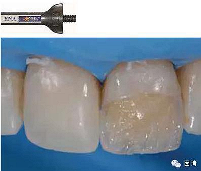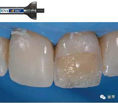 用小棉球或小刷子蘸15%—40%正磷酸酸蝕15—60秒,注意涂布要均勻,嚴(yán)格限制酸蝕范圍,勿涂到牙本質(zhì)和周圍的軟組織及粘接面以外的牙體組織上,以免健康牙體組織脫礦和牙齒術(shù)后敏感。然后要用氣槍高壓水進(jìn)行沖洗10—40秒,以去凈酸蝕劑和脫礦物質(zhì)。臨床上禁忌采用患者自行漱口的方式?jīng)_洗,以免唾液污染酸蝕面。隔濕吹干時用潔凈干燥的氣體,氣流方向應(yīng)做變換調(diào)整,以保證每個凹陷部位的干燥。吹干后釉質(zhì)表面失去光澤,呈白堊色。然后進(jìn)行粘接劑的涂布。用小毛刷或小海綿塊蘸取粘接劑,均勻涂布于酸蝕過的牙面,用潔凈柔風(fēng)吹勻,光照20秒。涂布前最好用成型片將患牙與鄰牙隔離以免發(fā)生粘連,同時注意避免樹脂粘結(jié)劑在成型片出堆積。