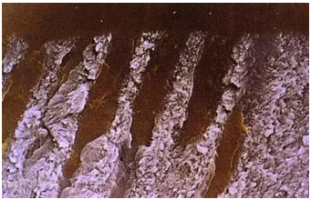 牙本質(zhì)縱斷面。管周牙本質(zhì)被去除,管間牙本質(zhì)膠原纖維暴露(放大倍數(shù)5000)