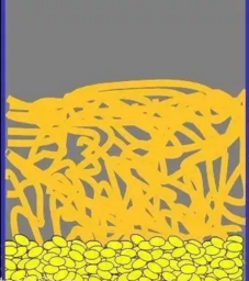 圖示酸蝕后的牙本質(zhì)層,玷污層已被清除,管周和管間牙本質(zhì)均有脫礦,膠原纖維暴露并富含水分。這種牙本質(zhì)具有高度親水性,對脫水非常敏感。藍色代表鈣組織結(jié)構(gòu)的含水量。