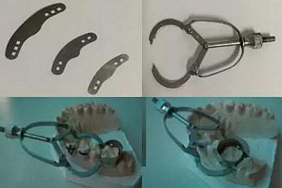 成形片:為不銹鋼的薄片,一側(cè)帶有2-3個孔。安裝時其中間突出部朝向齦方,由成形夾夾于小孔內(nèi)固定。