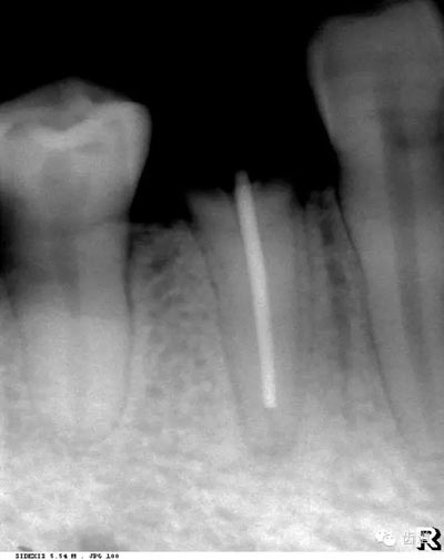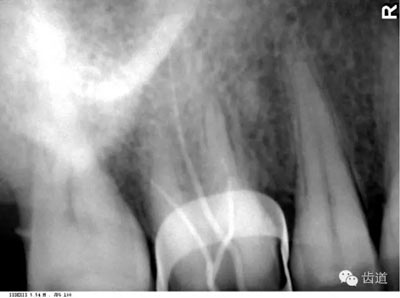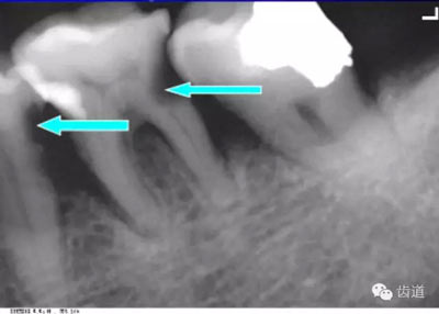 膠片在口內(nèi)放的位置過低,在牙根尖下方X線片上顯示為帶狀密度很高的影像。