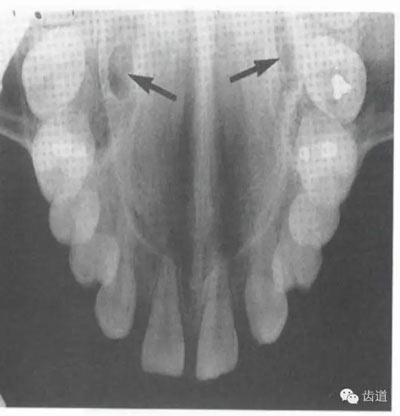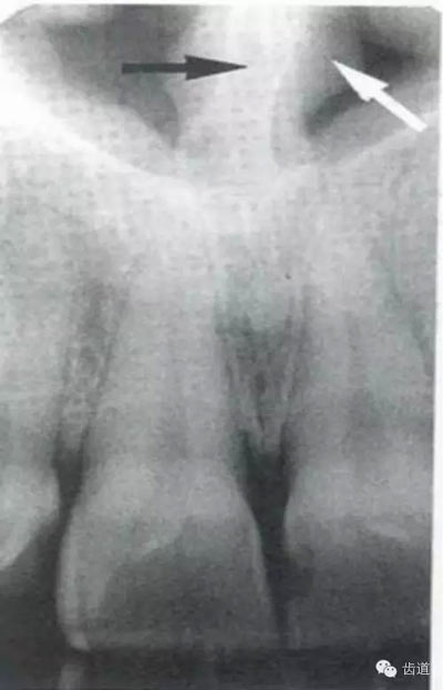 位于兩側(cè)中切牙牙根之間,由牙槽突向上,呈直線狀密度低的影像。其兩側(cè)為密度高的影像,為兩側(cè)上頜骨腭突的致密骨層。