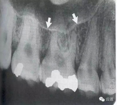 牙頸部Burnout征象:有時因投照技術(shù)問題而造成牙頸部近中或遠(yuǎn)中呈低密度影像,位于牙釉質(zhì)和牙槽嵴頂之間。