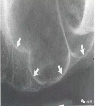 在正中聯(lián)合的兩旁,各有一致密影像帶,呈八字形延長至前磨牙區(qū),是頦嵴的影像。