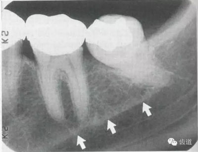位于磨牙牙根尖下方,呈寬約為0.4cm凹面向下邊緣整齊的帶狀密度低的影像,其兩側(cè)有密度高的線條狀影像,為下頜管骨密質(zhì)