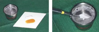 ▼圖29-9(左) 將催化劑和膏劑等量放在調(diào)和板上調(diào)和,然后再準(zhǔn)備含有數(shù)滴手消毒用中性肥皂水的清水(分離劑)。