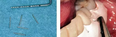 ▼圖29-17(左) 自己做的增加塞治劑穩(wěn)固性的線。可以用正畸用的結(jié)扎線