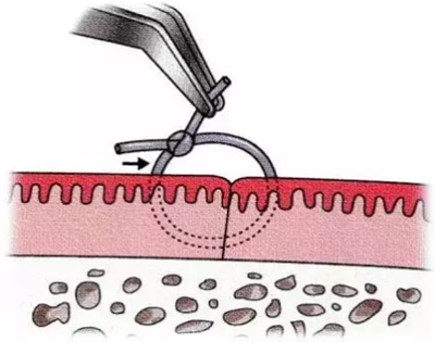 ▼圖31-2如果是垂直褥式縫合,用鑷子將打結(jié)處夾住,稍稍往上牽拉,在打結(jié)處的下方(圖中尖頭所示)剪斷。